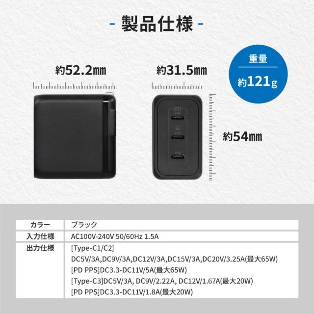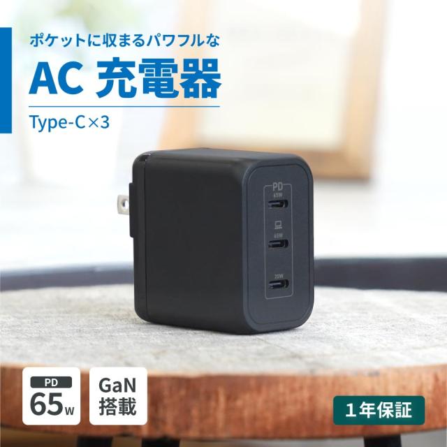 AC充電器 USB Type-C×3 最大PD65W出力 GaN採用