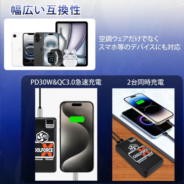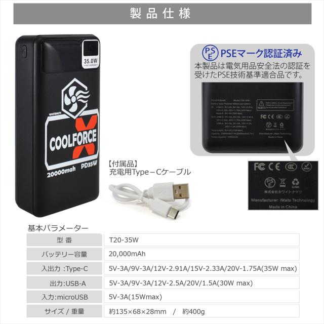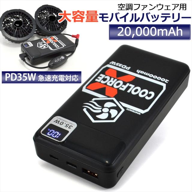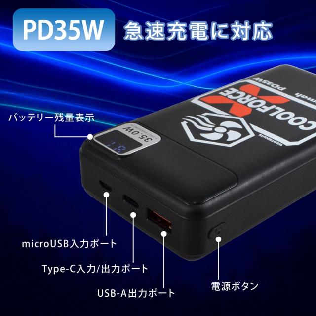【PSE認証済み】 PD35W モバイルバッテリー 20000mAh 大容量 空調ウェア 対応 ファンバッテリー ファン 長時間連続稼働 急速充電 スマホ充電器 スマホ デバイス 2台同時 同時充電 バッテリー残量表示 昇圧変換アダプター 熱中症対策 【 Type-C USB-A microUSB QC3.0 】
