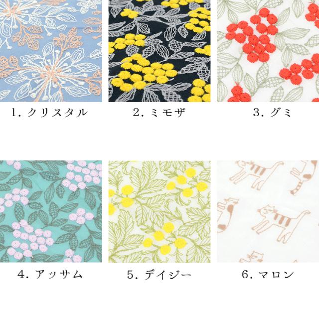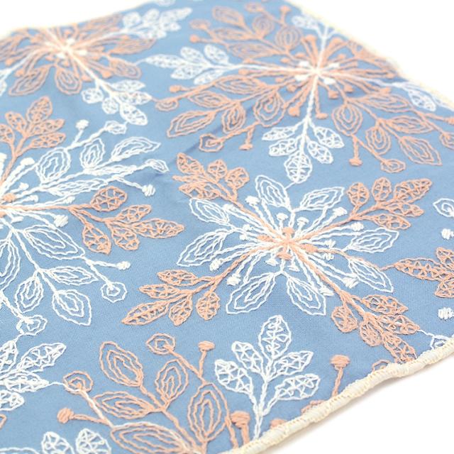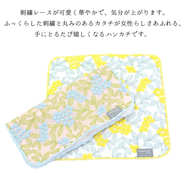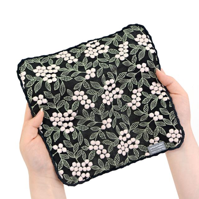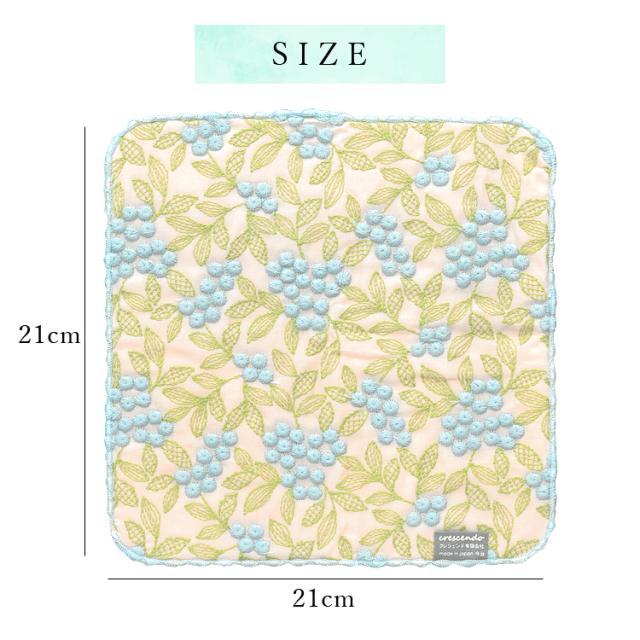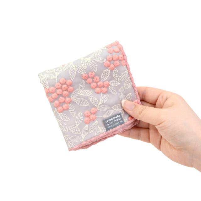 ふっくらした刺繍と丸みのあるカタチが女性らしさあふれる、手にとるたび嬉しくなるハンカチです。
