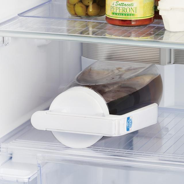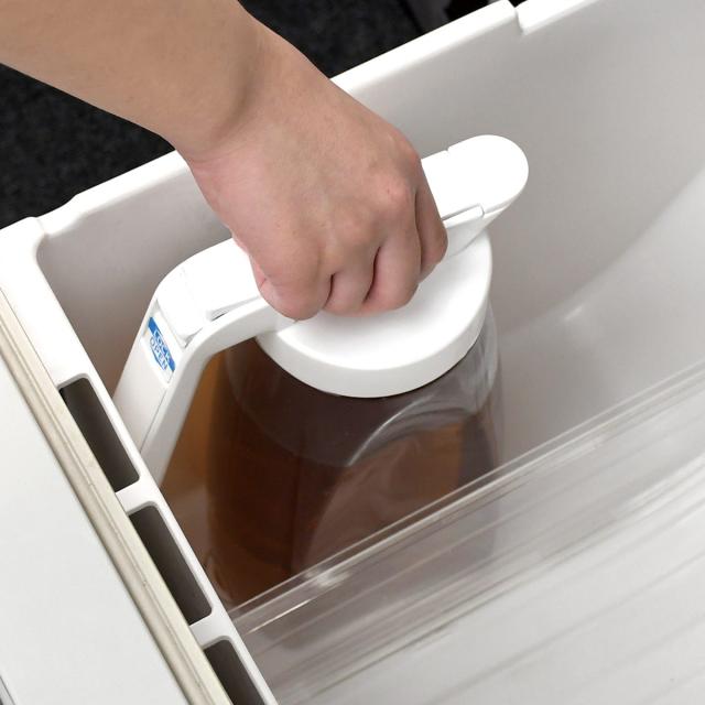 冷蔵庫のドアポケットにすっきり収まるスリム設計です。野菜室の隙間にも入れられ、3Lと大容量ながら省スペースに収納できます。
