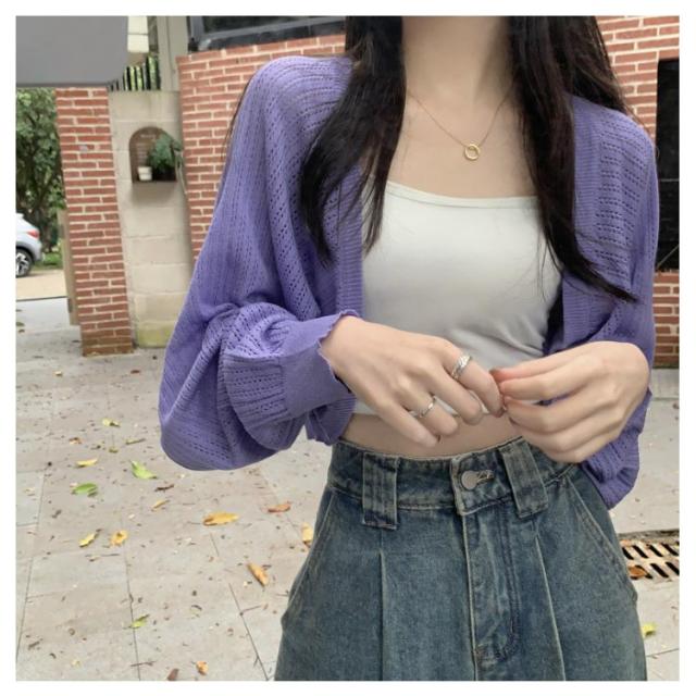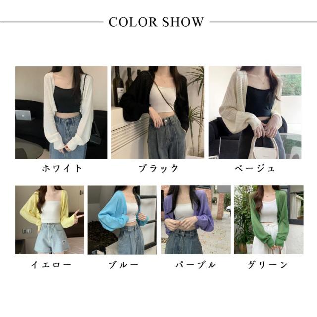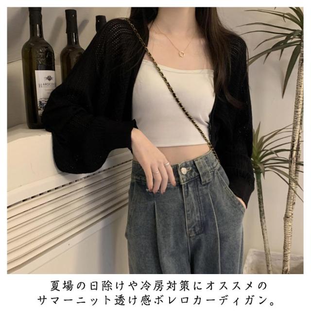 ボレロ風 サマーカーディガン バルーンスリーブ カーディガン 可愛い 透かし編み サマーニット 透け感 シアー カーディガン シースルー ショート丈 ニットカーディガン レイヤード