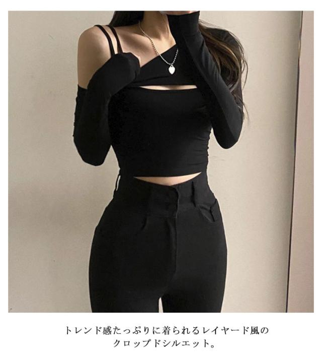 個性 ?シングルショルダー レディース ファション 長袖Tシャツ タンクトップ カットソー 韓国 カットソー ストリート トップス へそ出し 女性用 長袖 2点セット セクシー 可愛い イベント 団体服 演出