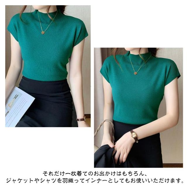 | これからの季節に重宝する半袖リブニットです。 伸縮性に優れている通気性良いニット素材で締め付け感を感じにくいのも嬉しいポイント。 ハイネックデザインの小顔効果で全体的にすっきり感を生み出します。 肩先をふんわり覆う長さで、少しだけ隠れる程度の長さなので、腕の肌見せ感が控えめ、大人っぽく上品に着こなせる。 それだけ一枚着てのお出かけはもちろん、ジャケットやシャツを羽織ってインナーとしてもお使いいただけます。 | |