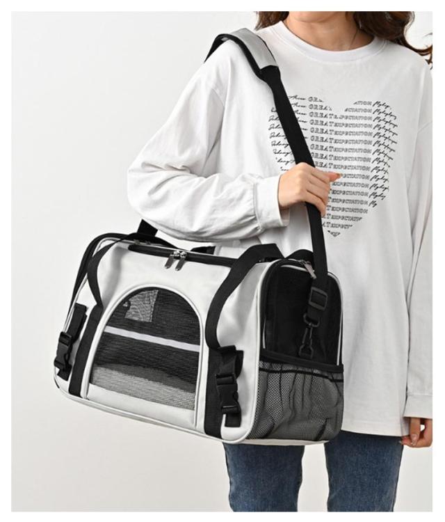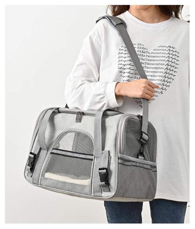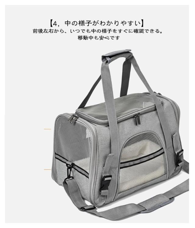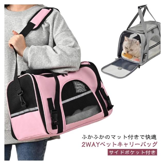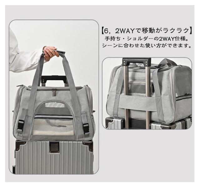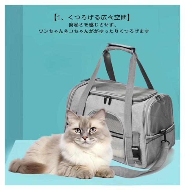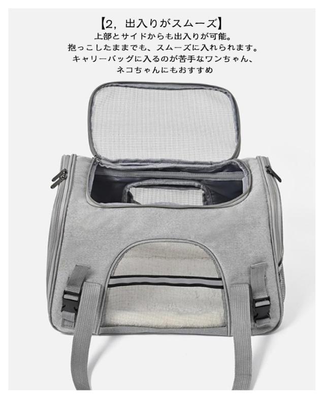 | ふかふかのマット付きで快適♪ 2WAYペットキャリーバッグ サイドポケット付き ◎選ばれる6つのポイント◎ 【1、くつろげる広々空間】 ・窮屈さを感じさせず、ワンちゃんネコちゃんががゆったりくつろげます◎ ・丈夫でしっかり、安定感が抜群です◎ ・ふかふかのマット付きで、ワンちゃんネコちゃん快適♪ ・カバーは、外してお洗濯が可能。ずっと衛生的に使えます◎ 【2,出入りがスムーズ】 上部とサイドからも出入りが可能。 抱っこしたままでも、スムーズに入れられます。 ・キャリーバッグに入るのが苦手なワンちゃん、ネコちゃんにもおすすめ◎ 【3,通気性が抜群】 丈夫なメッシュ素材で、通気性が抜群。 暑い季節も、安心してお出掛けができます。 引っ掻き傷にも強い、丈夫な素材◎ ・2つの便利なポケット付きで、リードやおやつ、診察券などをサッと取り出せる◎ 【4,中の様子がわかりやすい】 前後左右から、いつでも中の様子をすぐに確認できる。 移動中も安心です◎ 【5,折り畳みが可能】 使わない時は、折り畳んでコンパクトに収納可能。 置き場所にも困りません。 【6,2WAYで移動がラクラク】 手持ち・ショルダーの2WAY仕様。 シーンに合わせた使い方ができます。 ・手が痛くなりにくい、丈夫な持ち手 ・肩への負担が少ない、ショルダーベルト ◎◎こんなシーンにおすすめ◎◎ ・一緒のお出掛けに ・通院に ・ドライブに ・災害時の備えとして | |
