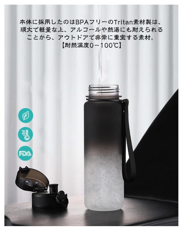 | Tritan製の頑丈な軽量ボトル。【1000ML】【BPAフリー】 本体に採用したのはBPAフリーのTritan素材製は、頑丈で軽量な上、アルコールや熱湯にも耐えられることから、アウトドアで非常に重宝する素材。【耐熱温度0−100℃】 映えるデザインとカラーバリエーションとおしゃれでシンプルなデザインになっています。お仕事やお出かけなどの幅広い場面で、自分らしさをスタイリッシュさを演出してくれます。 目盛りは、毎日の水分摂取量の測定に最適です。1日を通して毎日の水とフィットネスのニーズを満たすことができます。複数のシリコンシールリングとロック設計により、100%漏れ防止が可能です。 スポーツやフィットネス、ヨガの時の水分補給にもぴったりです。軽くて洗いやすいので、オフィスや学校での日常使いにもおすすめ。 | |