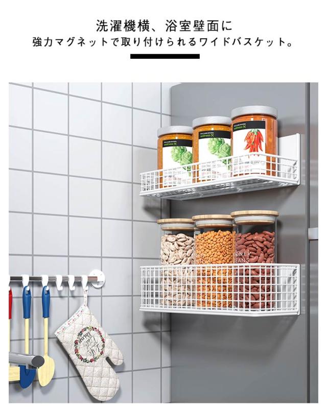 | 洗濯機横、浴室壁面に強力マグネットで取り付けられるワイドバスケット。【Sサイズ?Mサイズ】 ディスペンサーボトルを並べて収納。 強力マグネットなのでディスペンサーを入れたままポンプを押せます。 水切りワイパー・ブラシ・スプレー・バスブーツなどの収納にも。 水切れがいいので乾きやすく、おもちゃの収納にも便利。 設置面が少ないのでぬめりにくくお手入れ簡単。 | |