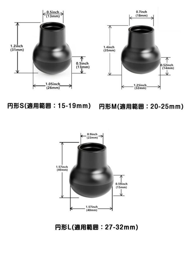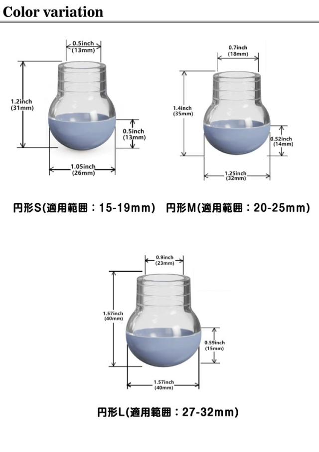 | サイズ | 円形S(適用範囲:15-19mm) 円形M(適用範囲:20-25mm) 円形L(適用範囲:27-32mm) 四角形M(適用範囲:20-25mm) 四角形L(適用範囲:27-32mm) |