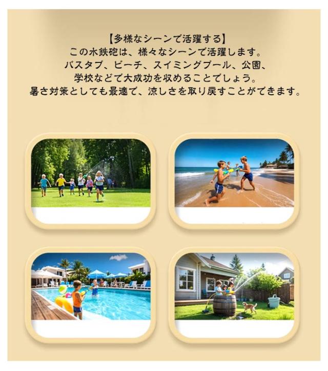 | 花火のようなデザインが特徴の「花火 水鉄砲 ウォーターガン」は、夏の水遊びを一層楽しくします。 【花火のような水鉄砲】この水鉄砲は、超強力な性能を備えており、水を花火のように勢いよく撃ち出します。夏の定番の水遊びに最適なおもちゃで、水ピストルとしての威力は子供から大人まで楽しめます。 【耐久性に優れた】高品質の素材を使用して作られており、耐久性に優れています。水にさらされることが多い水遊び用のおもちゃですが、長期間にわたって繰り返し使用しても、破損や劣化することがありません。 【使い勝手抜群】大きさで、持ちやすく使い勝手が抜群です。先を水の中に入れ、レバーを引いて水を得てから、レバーを押して水を噴霧します。 子供も大人も手に馴染みやすく、快適に水遊びを楽しむことができます。 【親子で楽しめる】この水鉄砲は軽量でコンパクトで、触り心地が良いので、お子様が握りやすくなっています。 プールとビーチに行って、すぐに暑さを吹き飛ばしましょう!親子ゲームとしても最適なこの水鉄砲は、家族みんなで一緒に楽しめるストリームマシンです。暑い今年の夏の外遊びにぴったり! 【多様なシーンで活躍する】この水鉄砲は、様々なシーンで活躍します。バスタブ、ビーチ、スイミングプール、公園、学校などで大成功を収めることでしょう。暑さ対策としても最適で、涼しさを取り戻すことができます。 | |
