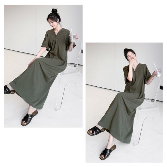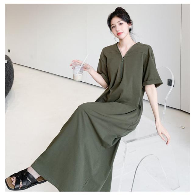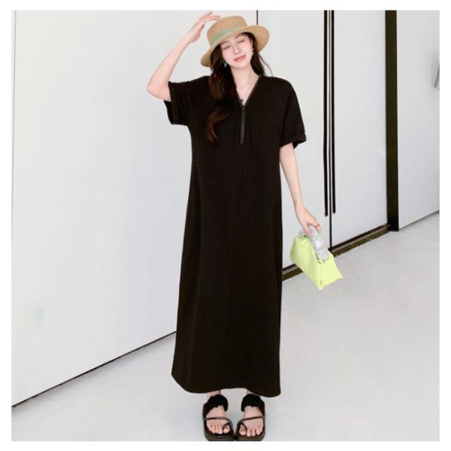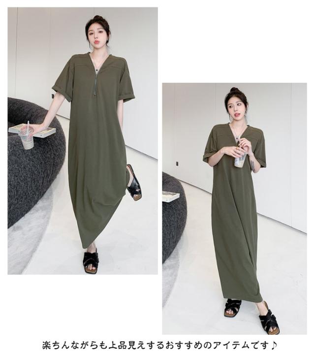 カジュアル 夏 半袖 Tシャツワンピース Tシャツワンピ Tシャツワンピース ロング丈 マキシ丈 ファスナーネック 体型カバー Vネック レディース ハーフジップ 無地 ゆったり 大きいサイズ 着痩せ ワンピース 夏 送料無料 黒 ブラック カーキ