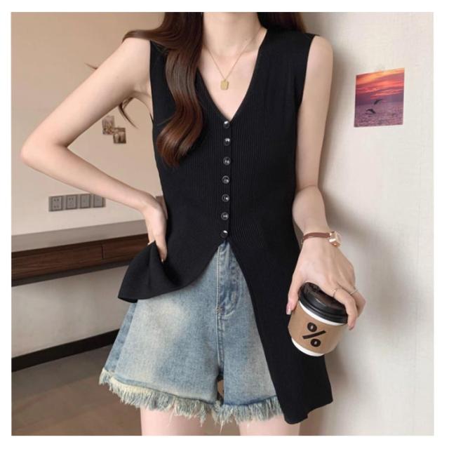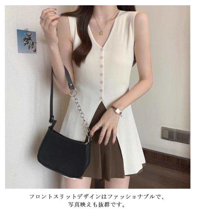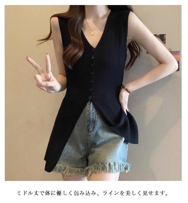 | 袖なしニットトップス登場! ミドル丈で体に優しく包み込み、ラインを美しく見せます。 ブラックとホワイトのな2色展開で、他のアイテムと合わせやすく、様々なスタイルを楽しめます。 フロントスリットデザインはファッショナブルで、写真映えも抜群です。 | |