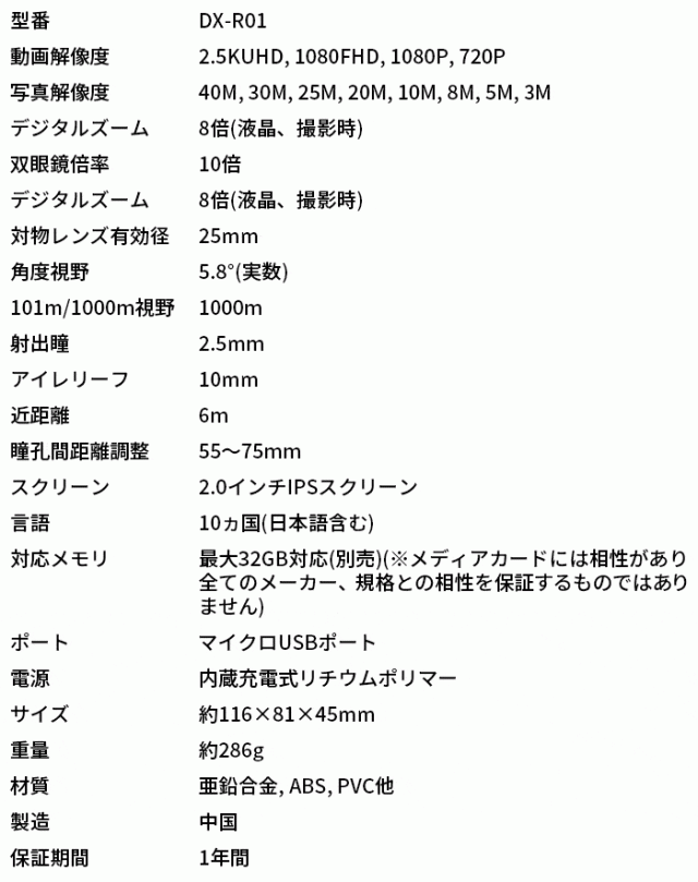 ■ DX-R01(録画ができる双眼鏡DX) スペック