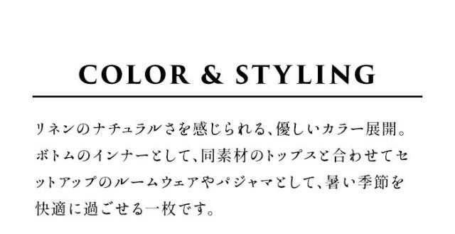 特徴 細番手の糸を使用した、フレンチリネンのペチパンツ。風通しの良い薄手素材で、暑い季節のインナーとして、サラッと涼やかな着心地です。柔らかな肌触りの生地なので、同素材のトップスと合わせて、ルームウェアやパジャマとしても、快適でリラックスして過ごせます。