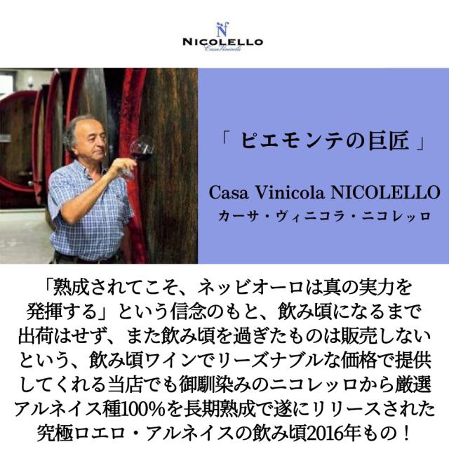 「熟成されてこそ、ネッビオーロは真の実力を発揮する」という信念のもと、飲み頃になるまで出荷はせず、また飲み頃を過ぎたものは販売しないという、飲み頃ワインでリーズナブルな価格で提供してくれる当店でも御馴染みのニコレッロから厳選アルネイス種100%を長期熟成で遂にリリースされた 究極ロエロ・アルネイスの飲み頃2016年もの!
