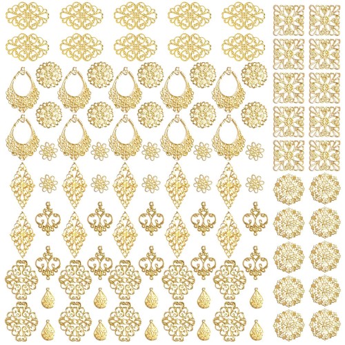 セット内容:10種類(1種類10枚の個包装)。 素材:鉄。 カラー:ゴールド。 DIYに最適:ピアス、イヤリング、ネックレス、ブレスレット、アンクレット、キーホルダー。 多用途:レジンに封入したり、プラバンや好きな形のアクリルパーツと組み合わせるのも可愛いです。 便利:透かしパーツは薄いプレート状の金属に穴が空いている形状なので、透かし模様の空いている部分にそのまま紐や金具でビーズやチャームなどを繋いで使うことが出来ます。