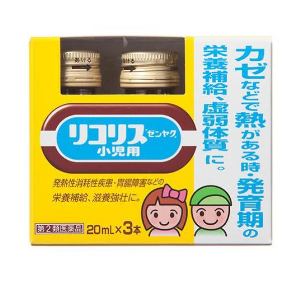 リコリス「ゼンヤク」小児用は,甘い生薬・カンゾウ(甘草)エキスを配合した、のみやすい味のお子さま用内服液剤です。かぜなどの発熱性消耗性疾患や胃腸障害・病中病後などの栄養補給に適しています。カフェインは配合しておりませんので、お休み前でも服用いただけます。
