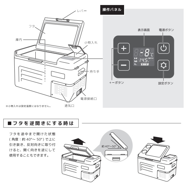●家庭用コンセント(AC100V)とシガーソケット(DC12/24V)に対応した小型の冷蔵冷凍庫。 ご家庭でセカンド冷蔵庫として使えるだけでなく、キャンプや車中泊などでも使用できます。 ●買いだめした食料品の保存、キッチン以外のお部屋でのドリンクの保管、車で外出したアウトドアでも。 ●フタの開閉方向の変更ができます。 ご使用される場所に合わせてセッティングしてください。 ■ 本体寸法 約 W600 × D320 × H340 mm ■ 本体重量 約 8.5kg ■ 容量 22L ■ 電源 AC100V 50/60Hz DC12/24V ■ 消費電力 65W ■ 設定温度 -20 〜 20℃(設定できる温度) ■ 冷却方式 コンプレッサー式 ■ 冷媒 R134a(26g) ■ 発泡剤 C5H10 / シクロペンタン ■ コード長さ AC電源コード+ACアダプター:約 2.1m DC電源コード:約 3.5m ■ 材質 HDPE、ABS ■ セット内容 本体、AC電源コード、ACアダプター、DC電源コード、取扱説明書(保証書) ※記載の数値は目安です。使用環境・状況により異なります。 ※本製品は、一般家庭専用です。 ※記載は商品仕様の一部です。仕様説明不足等の理由での返品はできません。特に適合等は必ずご確認ください。
