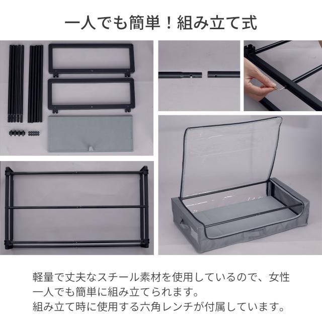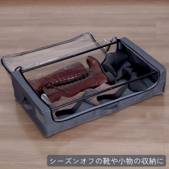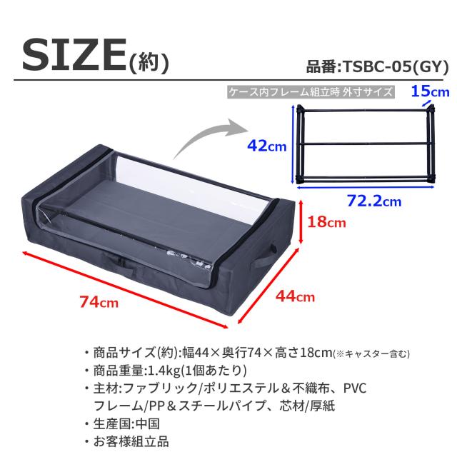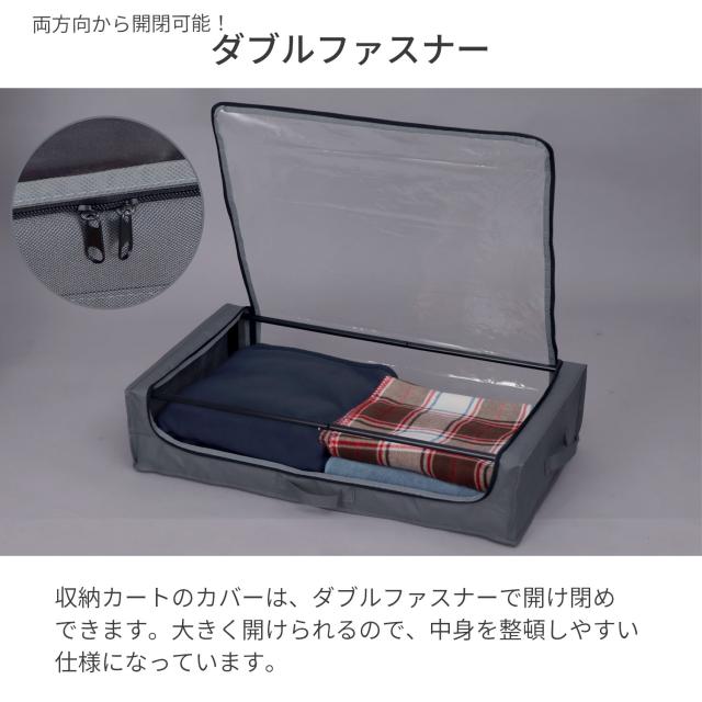 ベッドやソファ下などのちょっとした空きスペースを有効活用できる、浅型のキャスター付き収納ケースです。 ※こちらは単品販売のページです。ご購入の前にご確認ください。 ◆ベッド下収納カートの特徴・フタが透明のシートになっているので、収納した中身が見やすく、ホコリ除けにも役立ちます。 ・Wファスナー仕様で大きく開閉ができるので中身を整頓する時に大変便利です。 ・お部屋のインテリアに合わせやすいグレーカラーの収納ケースは、高さ約18cmで、ソファやベッド下などのすき間に収まるサイズです。 ・収納ケースの正面と両側面には取っ手付き。持ち運びしやすく、縦置き・横置きでも取り出しやすくなっています。 ・頑丈なスチール素材を使ったフレームに厚紙入りの底板が安定感のある造りになっています。 ・底面には、4つキャスターが付いていて、収納ケースの向きに合わせて縦・横置きどちらでも取り付けることが可能です。 ・通気性が良いポリエステル&不織布を使用。側面には、荷物の整頓に便利なラベルホルダーが付いています。 ※ラベルは付属しておりません。 ・軽量なので女性一人でも簡単に組み立てられます。組み立て時に使用する六角レンチが付属しています。 ・タオルやシーツなどの寝具、靴・バッグやベルト、ストールなどのオフシーズンの物、書籍やぬいぐるみ等、小物の収納にもおすすめです。 |
