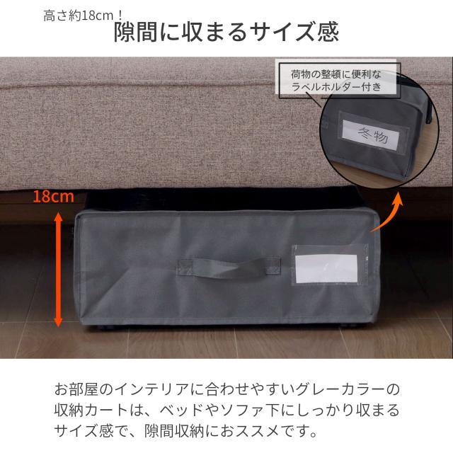 ・お部屋のインテリアに合わせやすいグレーカラーの収納ケースは、高さ約18cmで、ソファやベッド下などのすき間に収まるサイズです。