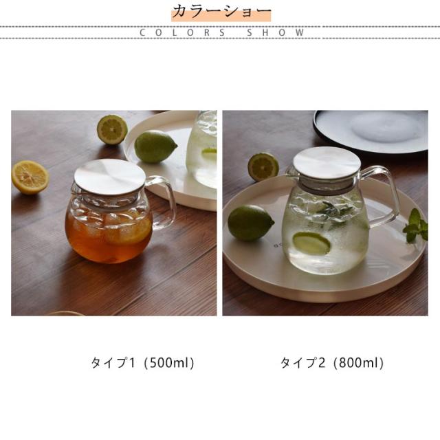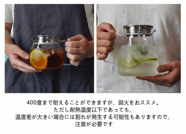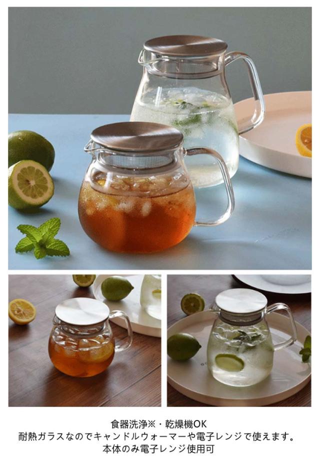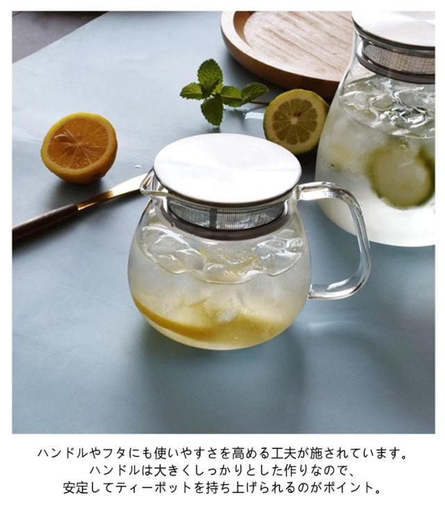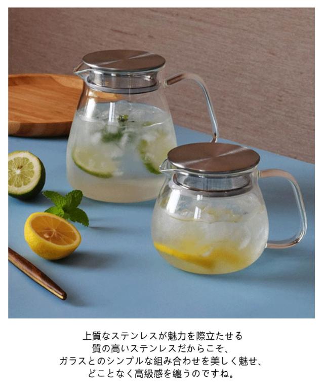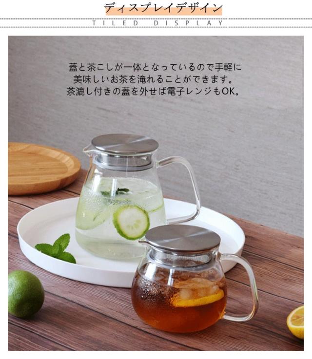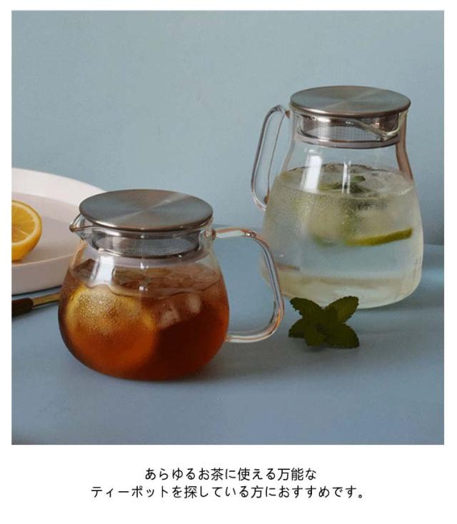 | 直火・電子レンジOK 500ml 800ml 耐熱ガラスだからできる万能型お茶ポット♪ 蓋と茶こしが一体となっているので手軽に美味しいお茶を淹れることができます。茶漉し付きの蓋を外せば電子レンジもOK。 ハンドルやフタにも使いやすさを高める工夫が施されています。 ハンドルは大きくしっかりとした作りなので、 安定してティーポットを持ち上げられるのがポイント。 上質なステンレスが魅力を際立たせる 質の高いステンレスだからこそ、 ガラスとのシンプルな組み合わせを美しく魅せ、 どことなく高級感を纏うのですね。 従来のガラス器の繊細なイメージを変える おおらかな使い心地です。 香りが移りにくいため、紅茶だけでなく 緑茶や中国茶など種類の違うお茶を楽しめるのも魅力です。 あらゆるお茶に使える万能なティーポットを探している方におすすめです。 400度まで耐えることができますが、弱火をおススメ。 ただし耐熱温度以下であっても、温度差が大きい場合には割れが発生する可能性もありますので、注意が必要です 食器洗浄※・乾燥機OK 耐熱ガラスなのでキャンドルウォーマーや電子レンジで使えます。 本体のみ電子レンジ使用可 電子レンジでのご使用の注意 ※電子レンジで使用する際は茶こしを外して下さい。 ※空の状態で使用しないで下さい。 ※突然一気に煮沸して激しく吹き出す恐れがあります。 ※電子レンジから本体を取り出す際は鍋つかみ等を使用し、顔などを近づけないで下さい。 ※電子レンジご使用後は鍋敷き等の上に置いて下さい。 ※電子レンジをご使用前は、本体の水滴を拭き取って下さい。 | |