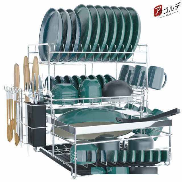 【水切りかごに食器を収納?台所の整理整頓】 今回の3段式な水切りカゴはふきん掛け、箸立て、まな板立て、包丁スタンド、カップスタンド、ボウルスタンド、ディッシュスタンド、ツール掛けフック付きで、お客様の用途によって自由に組み合わせて使用いただけます。様々な食器 をキッチンラックでスッキリ収納できます。 【大容量な3段式水切りラック?キッチンスペースを節約】弊社の最新の改良版な水切りラックは3段式な食器を収納できの設計で(各層は自由に組み合わせて使用可能)、キッチンのような狭い空間を有効的に活用いただけます。上段には最大12枚のお皿を収納でき、中段には最大16個のボウルを収納でき、下段にはボウル、調味料入れ、鍋、シンクまわり小物などを収納できます。包丁スタンドは3本を収納でき、箸立てホルダーが20本を収納できます。3-5人家族の食器をスッキリと収納できます。キッチンが狭く感じを解消し、キッチンの限られたスペースを広々使える食器収納ラックです。 【防錆?傷に強い塗装?頑丈な炭素鋼製】水切りかごの本体表面に粉体焼き付け塗装のコーティングを施すことで、見た目も美しく、高級感があるだけでなく、傷や擦れにも強く、防錆性もとても高く耐久性抜群で