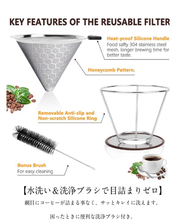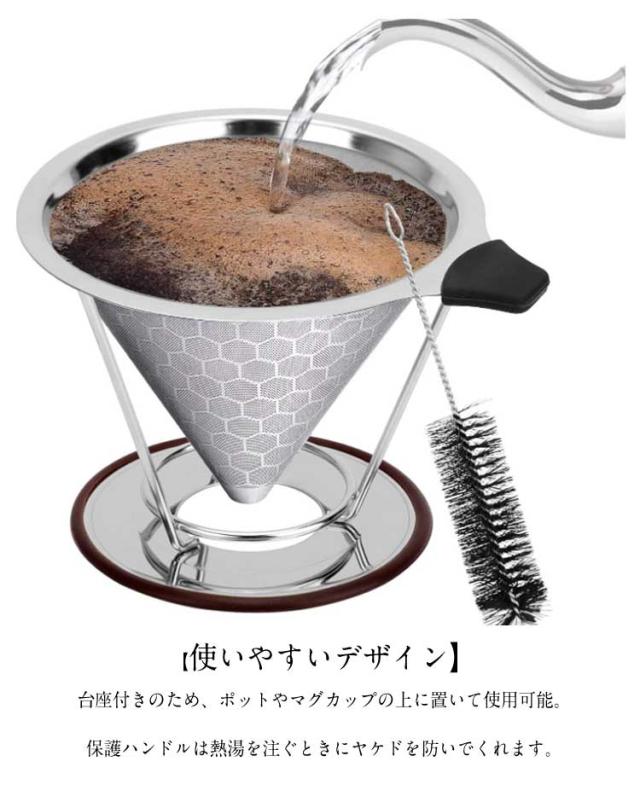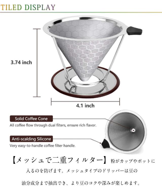 洗浄ブラシ付き ハンドドリッパー ドリップ コーヒードリッパー メッシュ構造具 コーヒードリッパー ペーパーレス ステンレス お洒落 スタンド ハンドドリップ フィルター不要 珈琲用 1-2杯用 2-4杯用 キャンプ アウトドア