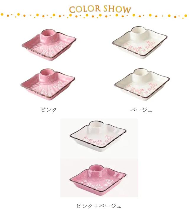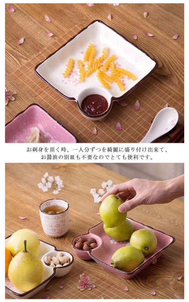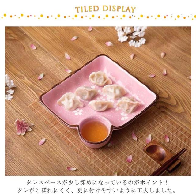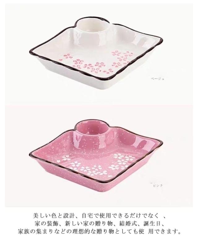 | 美しい桜で食卓を優しい雰囲気に♪ タレスペースが少し深めになっているのがポイント!タレがこぼれにくく、更に付けやすいように工夫しました。 ギョウザやしゅうまい、春巻き、お寿司にお刺身など何にでもOKなオールマイティープレート! お刺身を頂く時、一人分ずつを綺麗に盛り付け出来て、お醤油の別皿も不要なのでとても便利です。 美しい色と設計、自宅で使用できるだけでなく 、家の装飾、新しい家の贈り物、結婚式、誕生日、家族の集まりなどの理想的な贈り物としても使 用できます。 | |