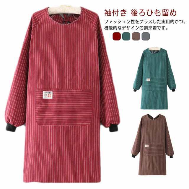レディース 後ろひも留め 割烹着 袖付き 保育士 かっぽう着 長袖 エプロン 大人 大きいサイズ ストライプ柄 メンズ ポケット付き 保育士 北欧 料理教室 キッチン 割烹着 エプロン ゆったり 大きめ シンプル