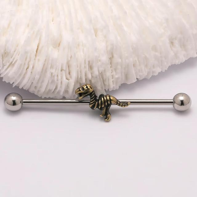 サージカルステンレス316L製の14ゲージのストレートバーベルに真鍮製の金色の恐竜の化石のモチーフをセットしたインダストリアル用ボディピアス。