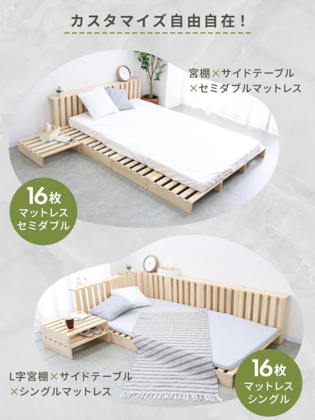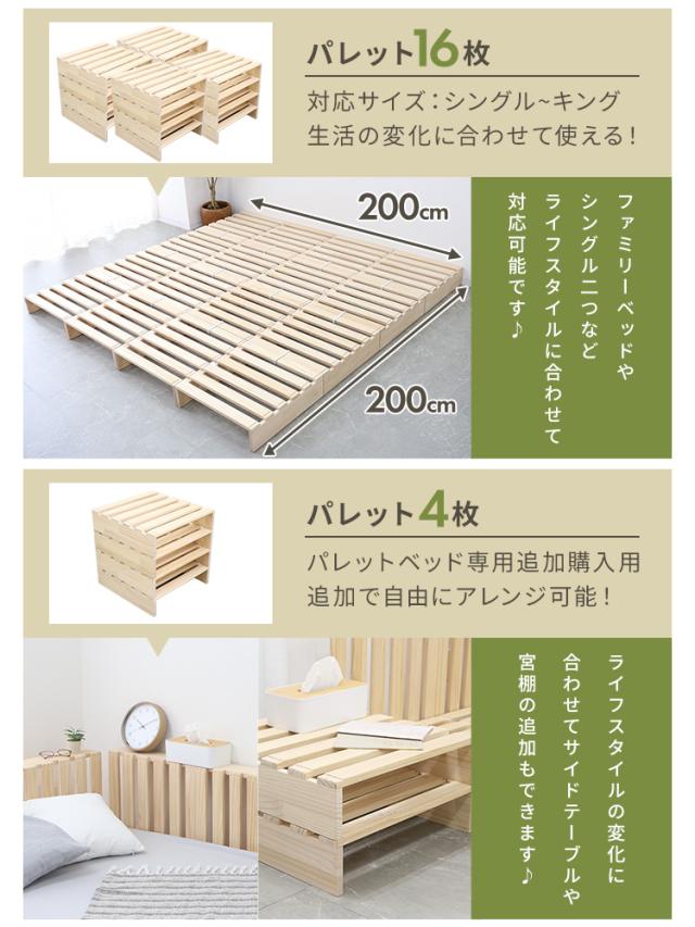 パレット構造だから、シングル・ダブル・キングサイズなどお好みのサイズにアレンジしたり、 宮棚を作ったり、自由に組み合わせて使えます。