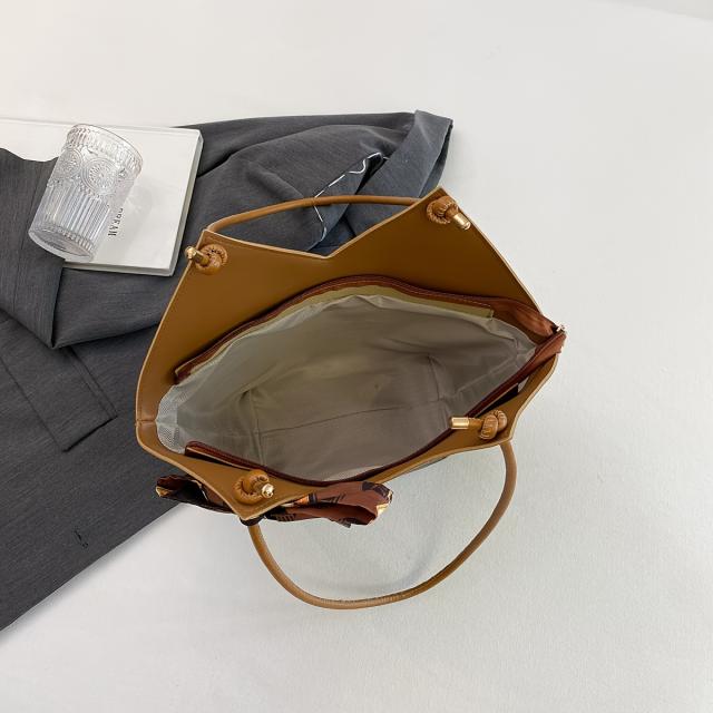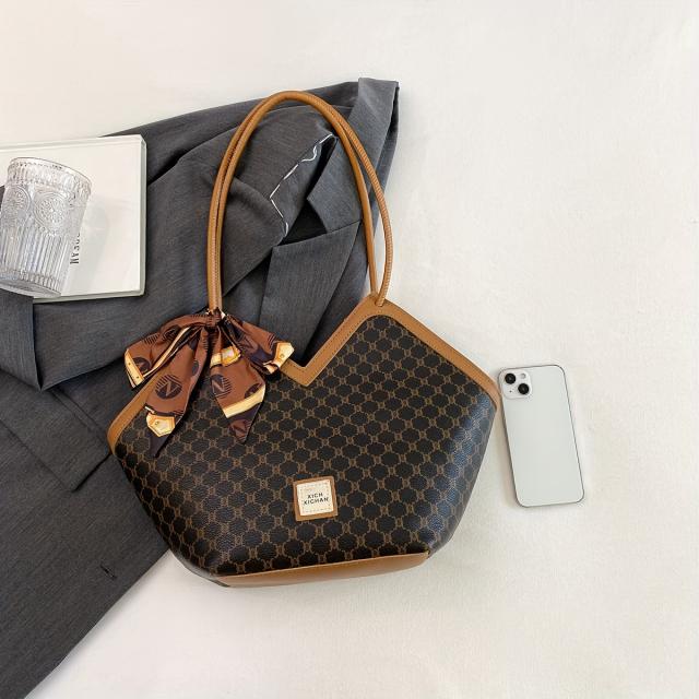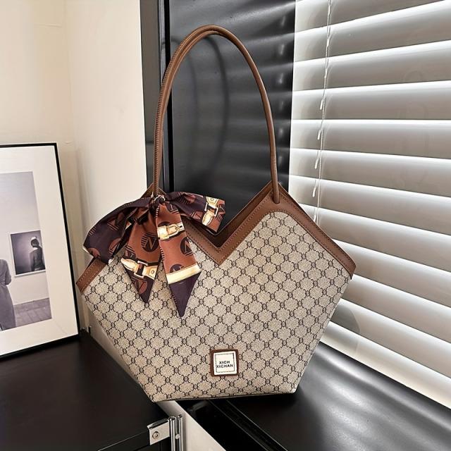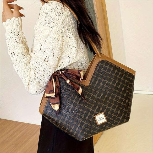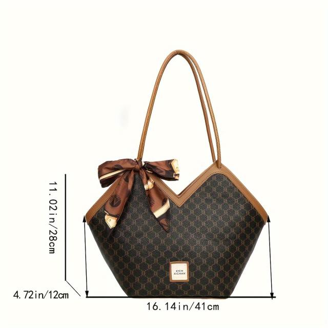 レディース エクストララージ トートバッグ - リボン結びのスタイリッシュなショルダーハンドバッグ、ブラック&ブラウン柄、ジッパークロージャー、日常使用に最適、レディースハンドバッグ