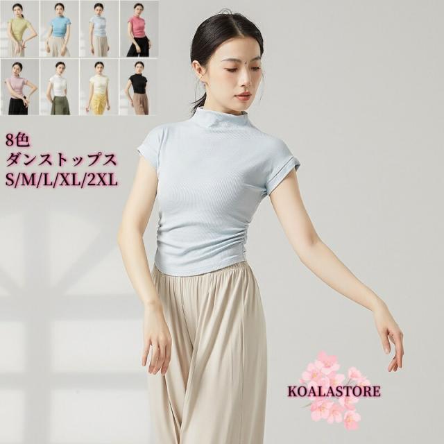 ダンストップス 半袖 ヨガウェア ハイネック フレンチスリーブ Tシャツ フィットネスウェア ダンスウェア ショート丈 春夏 ダンス教室 ダンス練習着 授業 稽古 レッスン着 ラテンダンス 古 団体服