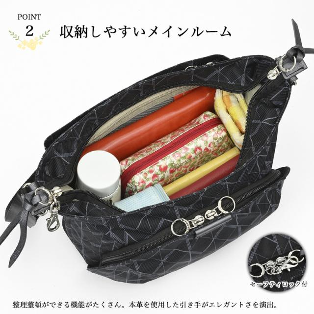 ベタ付けポケット×1、片マチポケット×1、ペンホルダー×1、キーフック×1を搭載。