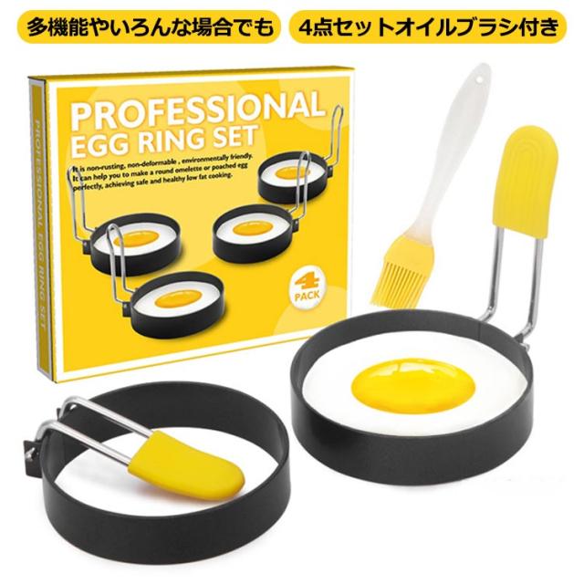 目玉焼きリング 4個セット オイルブラシ付き ステンレス製 焦げ付き防止 エッグリング 目玉焼き 型 目玉焼きの金型 パンケーキ 製菓道具 お菓子作り 手作り DIY お手入れ簡単 キャラ弁当 フライパン用 製菓道具 家庭用 キッチン 調理