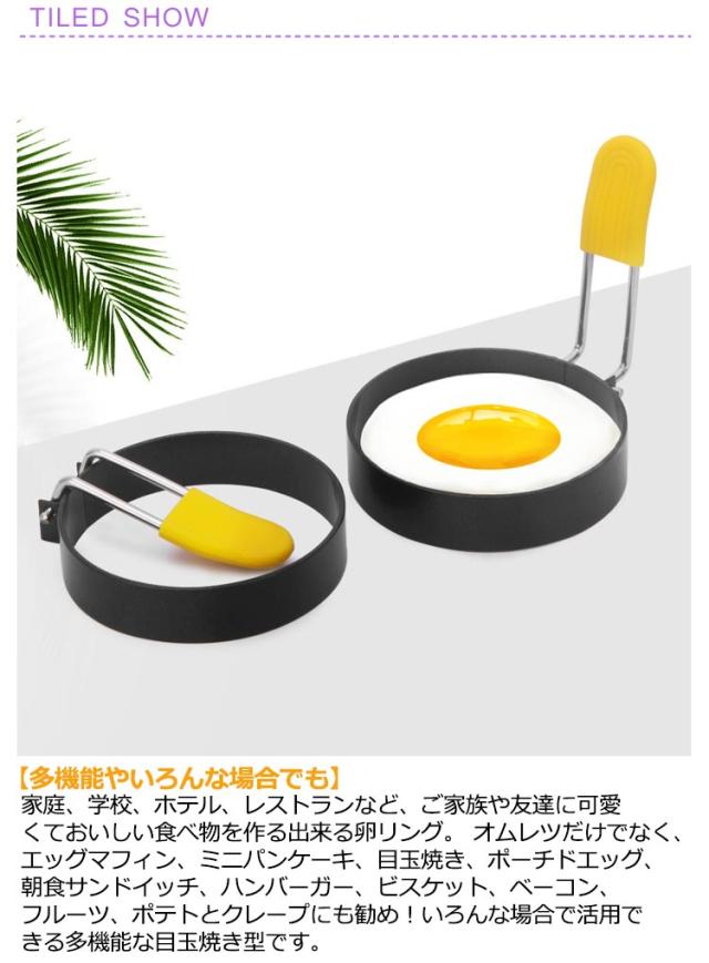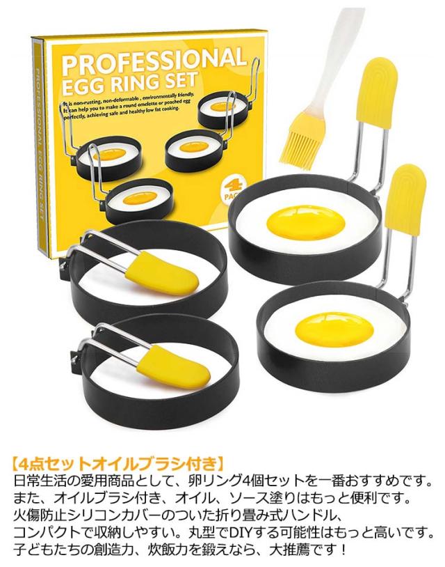 | 【多機能やいろんな場合でも】家庭、学校、ホテル、レストランなど、ご家族や友達に可愛くておいしい食べ物を作る出来る卵リング。 オムレツだけでなく、エッグマフィン、ミニパンケーキ、目玉焼き、ポーチドエッグ、朝食サンドイッチ、ハンバーガー、ビスケット、ベーコン、フルーツ、ポテトとクレープにも勧め!いろんな場合で活用できる多機能な目玉焼き型です。 【高品質卵リング】卵リングは高品質ステンレス素材を採用しており、食品グレードステンレス製で卵、オムレツ、パンケーキ、ハンバーガー、ホットケーキ食品の調理は安心します。ステンレス目玉焼きリング洗いやすい、変形にくい、耐熱性・耐摩耗性が優れ、食品を安全に調理可能です。 【4点セットオイルブラシ付き】日常生活の愛用商品として、卵リング4個セットを一番おすすめです。また、オイルブラシ付き、オイル、ソース塗りはもっと便利です。火傷防止シリコンカバーのついた折り畳み式ハンドル、コンパクトで収納しやすい。丸型でDIYする可能性はもっと高いです。子どもたちの創造力、炊飯力を鍛えなら、大推薦です! 【操作方法簡単】卵液を受け皿に入れ、湯で入れるだけで、丁度良く茹で卵や金型で指定のかわいい形状ができる。目玉焼き プレートはシリコンスリーブが付いており、使いやすいです。 | |