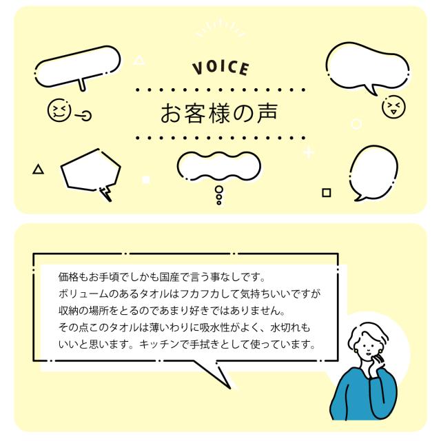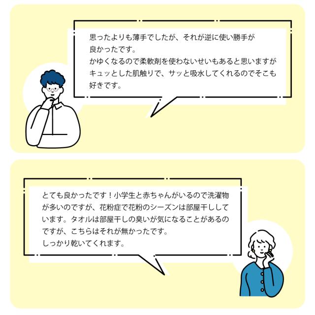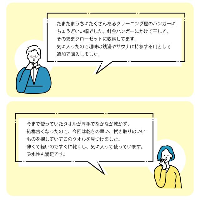 かさばらない・乾きがよい・吸水力が高い・清潔など、とにかく「日常生活で使いやすい」タオルをお探しの方にピッタリです。サラッとしたドライな肌ざわりも使い心地が良いと好評です。
