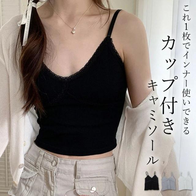 「リブで清楚感」キャミソール パッド付き ブラトップ Vネック レースライン 肩ひも調節 アジャスター トップス レディース リブニット インナー 下着 アンダーウェア ノースリーブ レイヤード 薄手 伸縮性 無地 黒 白