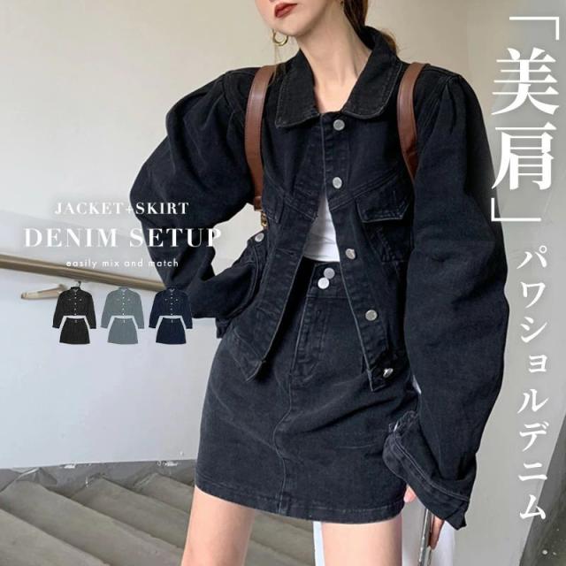 デニム ジャケット タイトデニムスカート セットアップ レディース Gジャン ジージャン 春 秋 冬 2点セット 上下 長袖 トップス ボトムス 黒 ゆったり 前開き フロントオープン アメカジ ボーイッシュ ベルトループ ジッパー