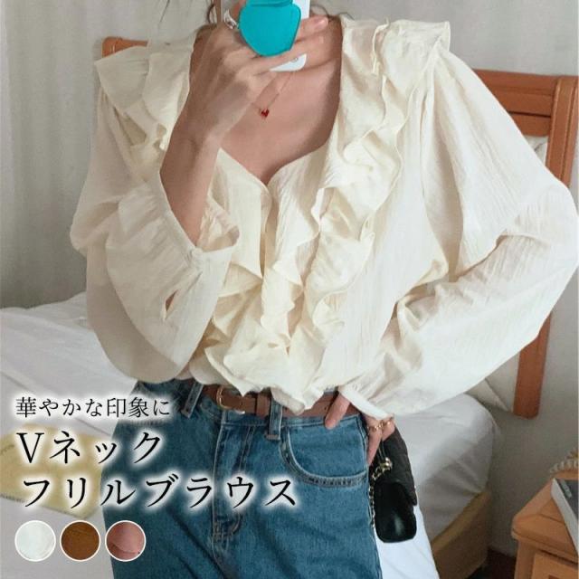 ブラウス レディース 長袖 おしゃれ きれいめ 春秋 ゆったり トップス シャツ コットンブラウス Vネック デコルテ 薄手 透け感 白 フリル ひらひら パフスリーブ ボリューム袖 前開き フロントボタン ワッシャー加工 シワ加工 ナチュラル