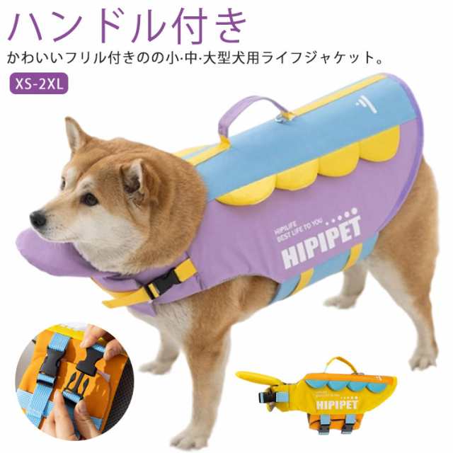 | かわいいフリル付きのの小?中?大型犬用ライフジャケット。【ハンドル付き】【XS-2XL】 内部はさらに厚めの浮力材料を充填しています。十分に補強する背中のハンドルは緊急な時に犬を水から引き上げることができます。 ペットライフジャケットの首回りと胴回りはマジックテープとバックルを使って装着が簡単になります。愛犬が束?される感覚がないで、着脱に手間取らないカンタンさ、飼い主にもわんちゃんにも楽チン。 最高品質の防水布と高浮力のポリエチレンフォームは、あなたの最愛のペットが水中で泳ぐのに非常に役立ち、夏には優れたアイテムになります。海や川水遊び、犬の水泳訓練などのアウトドア活動がおすすめ! | |