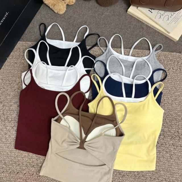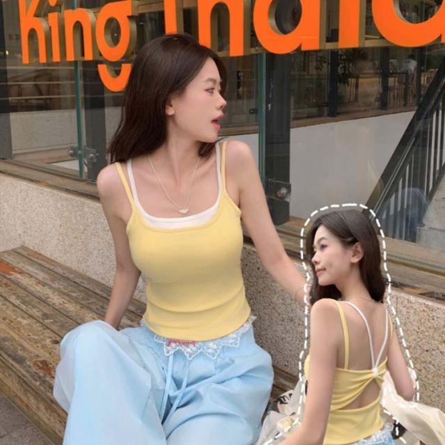 重ね着風 カップ付きキャミソール バックシャン フェイクレイヤード キャミソール トップス タンク キャミ バックオープンブラトップ 背中あき インナー 背中見せ 背中 開き