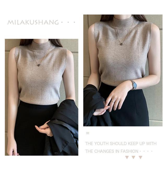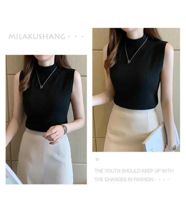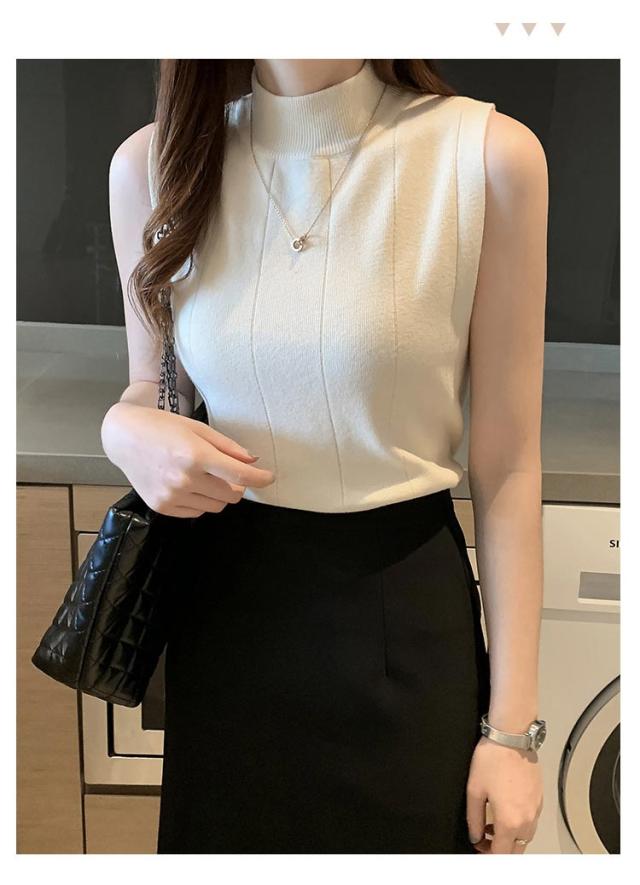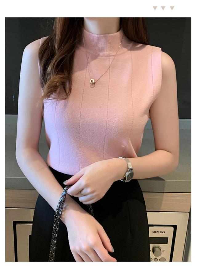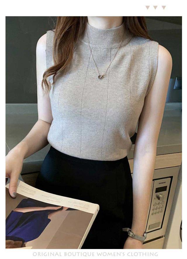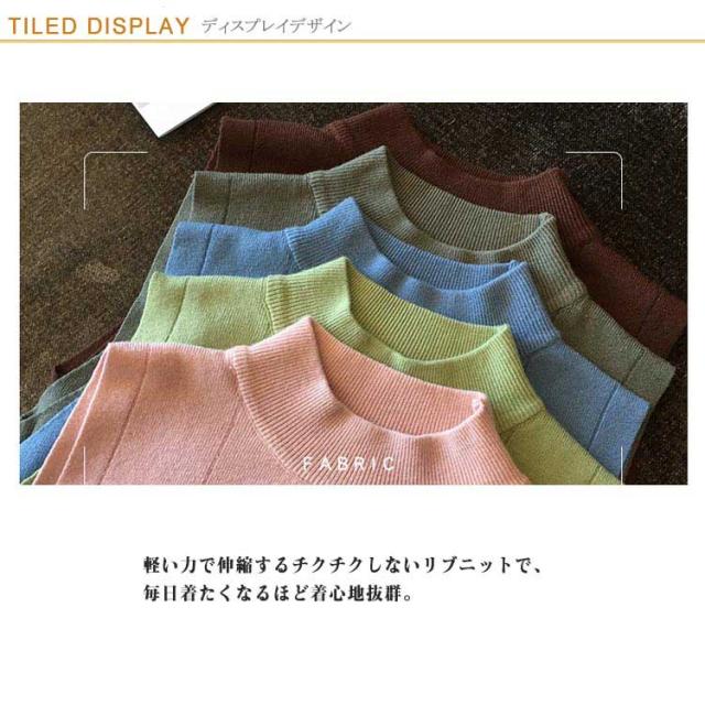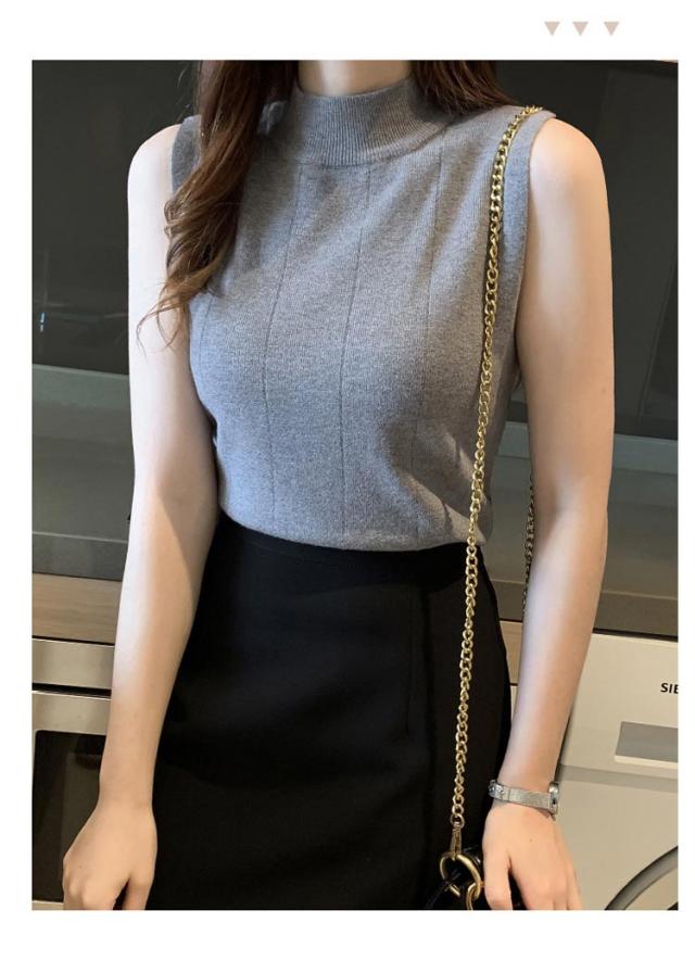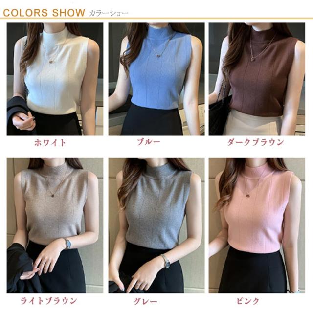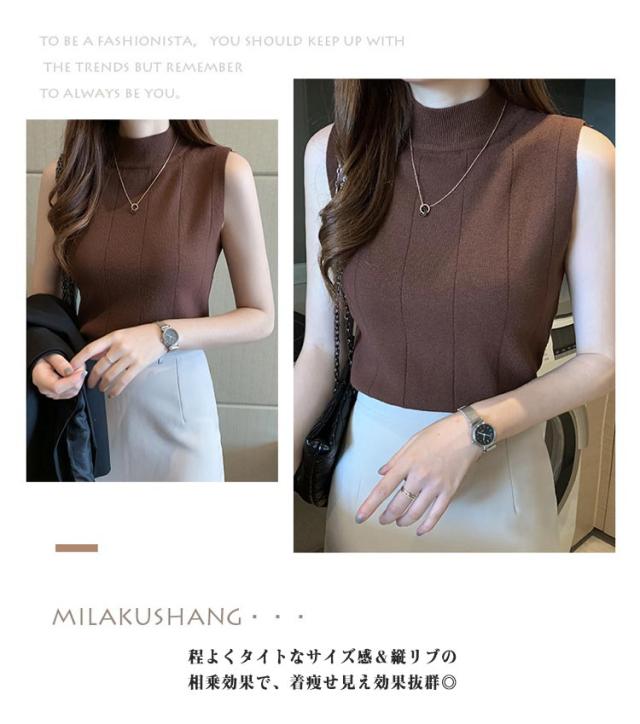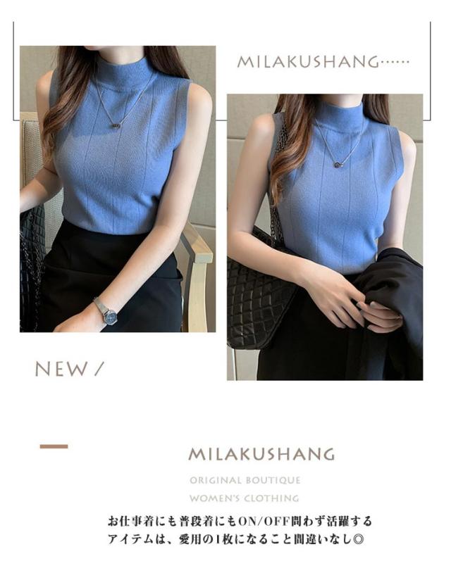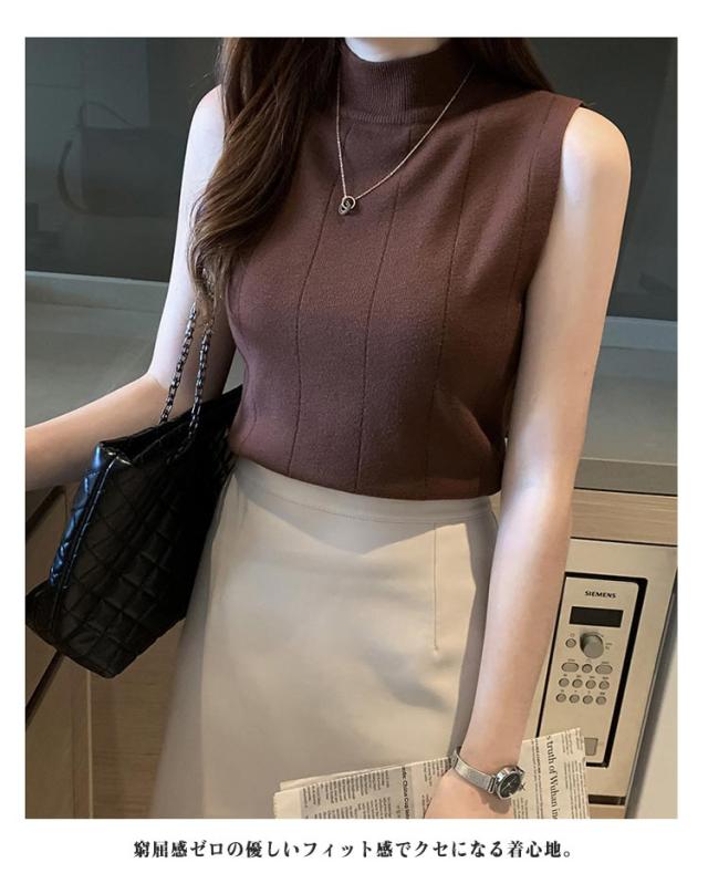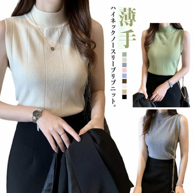 レディース ハイネック カットソー 袖なし サマーニット キャミソール ニット Tシャツ ニット 夏 細見え 薄手 トップス 重ね着 無地 タンクトップ リブ編み 仕事着