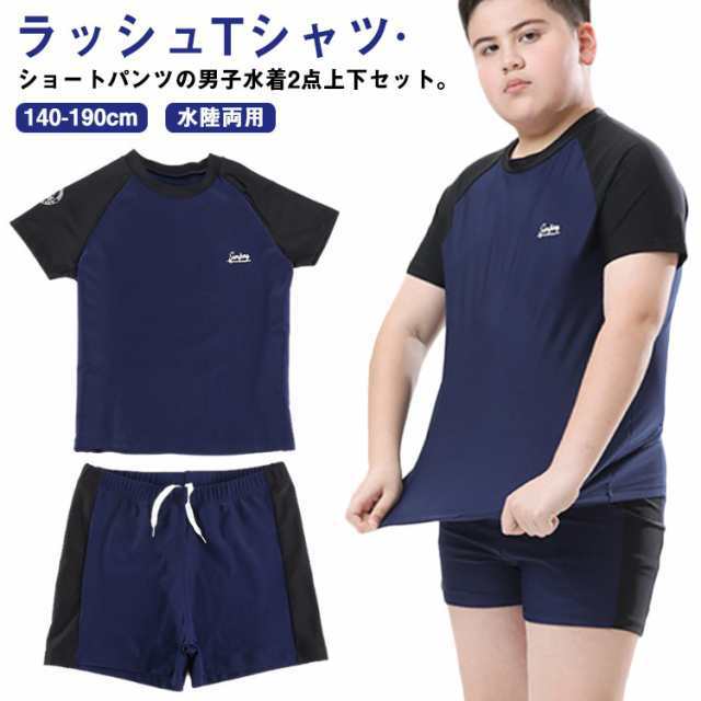 キッズ 水着 男子 セパレート 上下2点セット 半袖 ラッシュTシャツ ショートパンツ ラッシュガード 配色 ストレッチ 超 大きいサイズ 140 150 160 170 180 cm 中学生 高校生 メンズ 大人 速乾 水陸両用 水着 プール 海 川 リゾート 水遊び