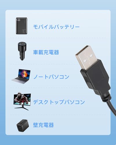 便利なUSB充電: 標準のUSB充電ポートに対応しているため、家でも、オフィスでも、旅行中でも、パワーバンクやノートパソコン、USBアダプターなど、USB対応機器で簡単に充電可能です。