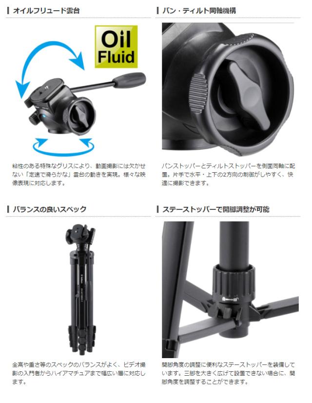 「パン」・「ティルト」2方向のストッパーを側面同軸に配置した、操作性重視のオイルフリュード雲台を装備。