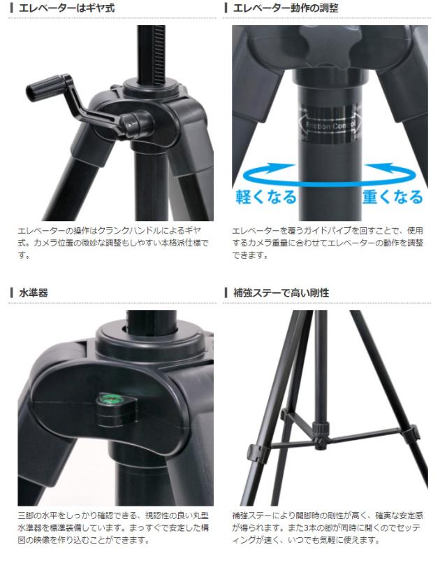 軽くて伸縮比にも優れたEXパイプを用いたビデオ三脚。