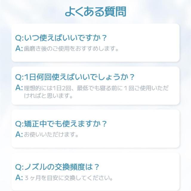 1.自宅での口腔清浄ケア:従来の歯ブラシは歯や口腔内の表面だけが清浄できて、歯の間や歯肉溝などが清浄できずに食物残渣が残ってしまいます。口腔洗浄器はタンクに貯めた水を細く高圧に噴射して、水柱が隅まで届いて、口内の死角もきれいに清浄してくれます。