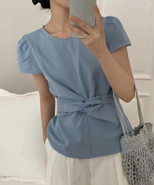 ふんわりとしたフレンチスリーブに、ウエストをリボンでキュッと結べるフェミニンなデザインが魅力のブラウス。程よいハリ感のある素材を使用し、立体感のあるシルエットの一着。