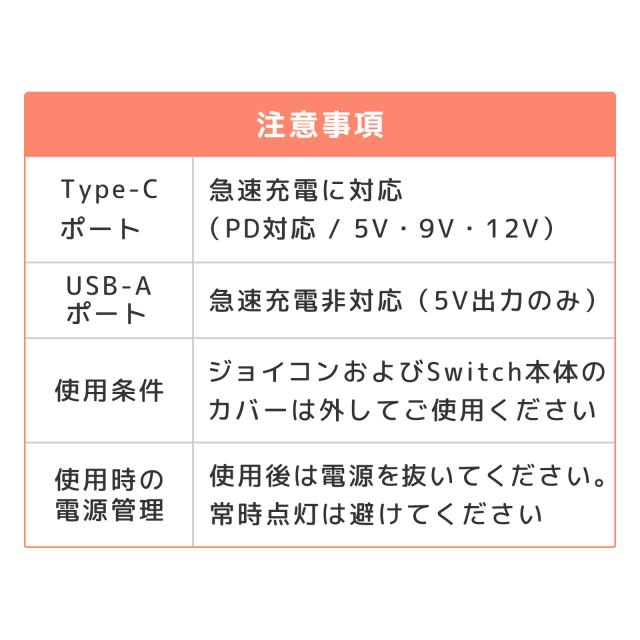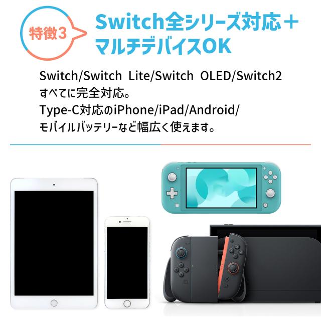 | 特徴 | 【 ついに登場!便利な充電スタンド 】 【 優れた5つの特徴 】 (1) Switchに最適な「安全充電」設計 (2) Type-C+USB-Aの2ポート搭載で同時充電OK (3) 急速充電対応でゲーム中も充電できる (4) スマート&コンパクトなデザイン (5) Switchシリーズだけでなくマルチデバイス対応 【 Switchにぴったり!安心して長く使える安全設計 】 発熱や電力不足の心配なし。Switch2にも対応していて、長時間プレイ中でも安心して使える設計です。 【 2台同時に充電できてとっても便利 】 Type-Cケーブル内蔵+USB-Aポートで、Switchとスマホなど2台を同時に充電できます。 【 ゲーム中でもサクッと急速チャージ 】 PD対応のType-Cで最大18W出力。Switchやスマホがすばやく充電できてイライラしません。 【 車内でもすっきり!おしゃれなミニマルデザイン 】 見た目もスマートで、ケーブルの差し口も目立ちません。車の中でもじゃまになりません。 【 いろんな機器に使えるから大活躍 】 Switchシリーズ全対応!iPhone、Android、iPadなど、ほとんどのType-C対応機器に使えます。 |