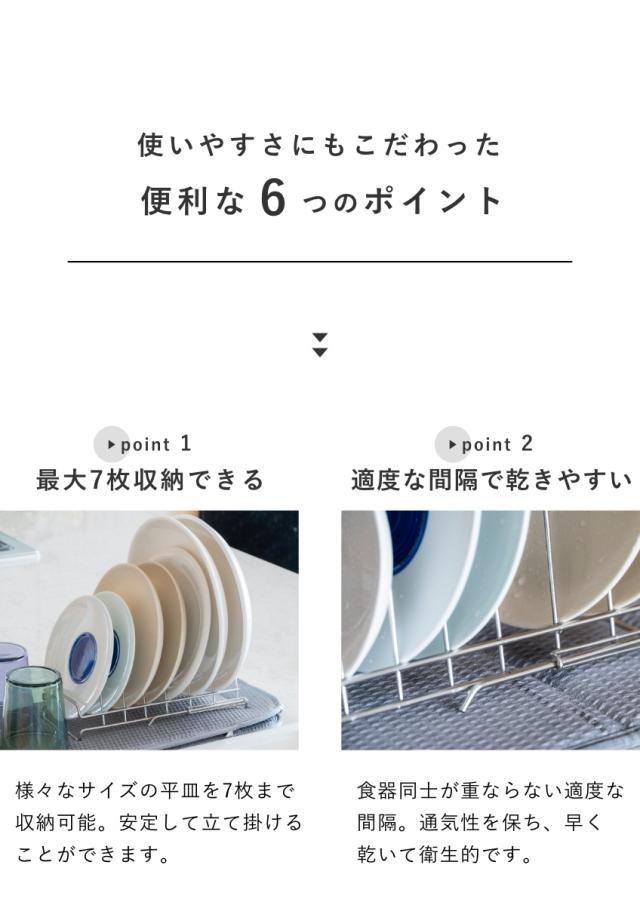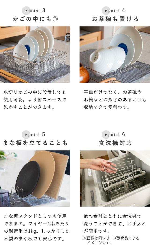 すっきり暮らす水切りかごと組み合わせて使うのにぴったりなディッシュラックです。すっきり暮らす水切りかごでは立てられない平皿を立てて乾かせます。水切りかごに加えるだけで、さらに快適な暮らしが始まります。