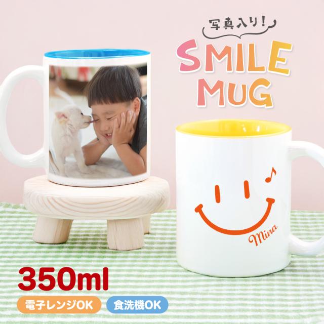 名入れ・写真プリント無料 ニコちゃんマーク 写真入り マグカップ オシャレ コップ ホワイト スマイル 名入れ 名前入り 写真・メッセージ入り 陶器 白 カップル ギフト プレゼント 結婚祝い お祝い 誕生日 父の日 母の日 送料無料